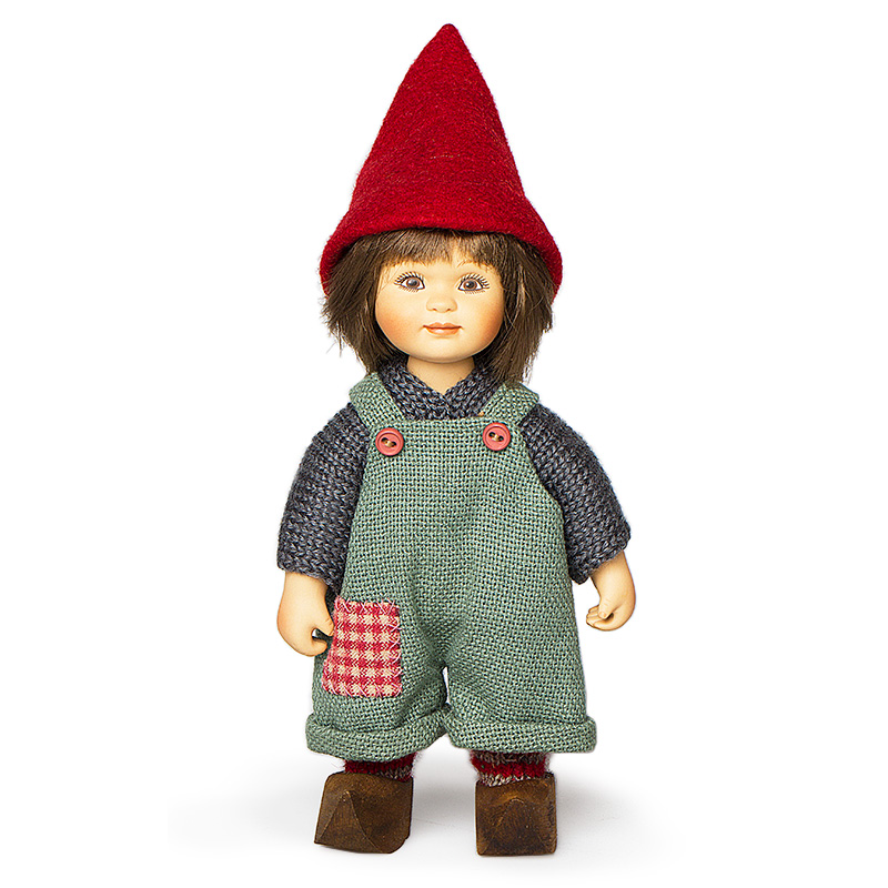 Голова, ручки и ножки куклы выполнены из высококачественного фарфора, имеющего идеально гладкую поверхность, защищенного от выцветания. Наряд куклы пошит из высококачественных натуральных материалов. Одежда, деревянные башмачки, колпачок удивительно гармонируют и помогают поверить, что перед Вами действительно сказочный персонаж.