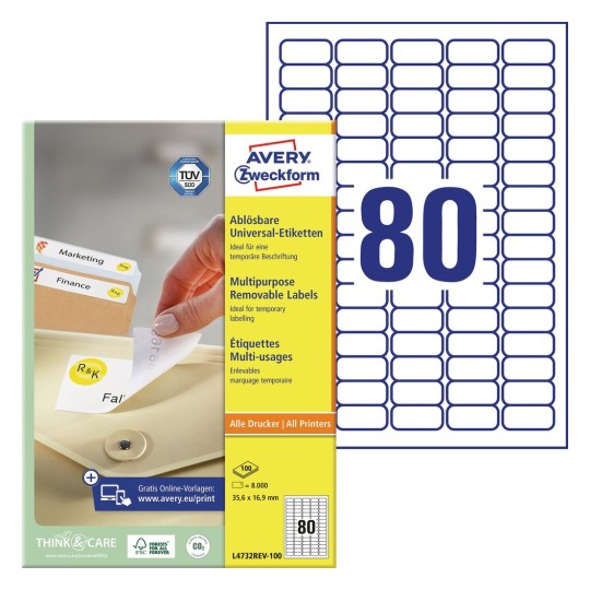 Этикетки самоклеящиеся удаляемые Avery Zweckform, белые, 35.6 x 16.9 мм, 80 шт. на листе, 100 листов